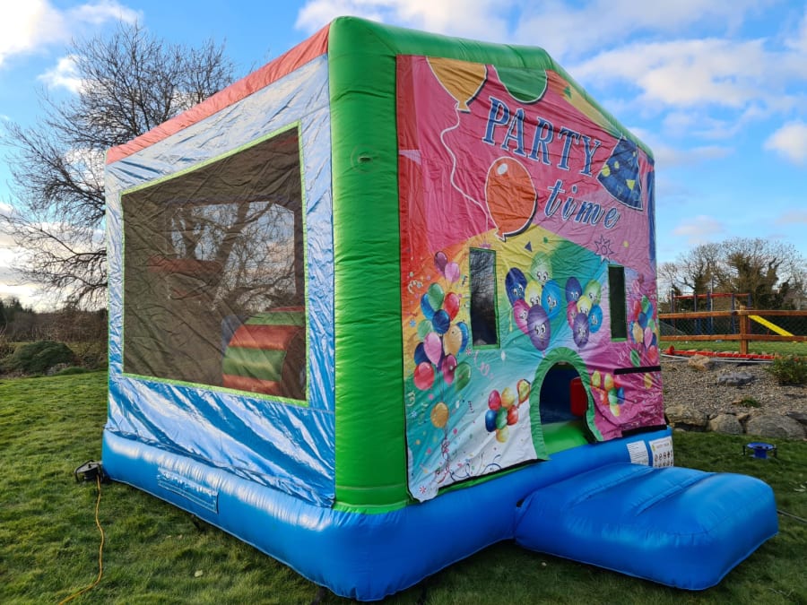 A box castle with all the bells and whistles (so to speak). Fully enclosed to stop the young ones from falling out. This also protects your kids from sun damage and stops light rain from ruining the fun.